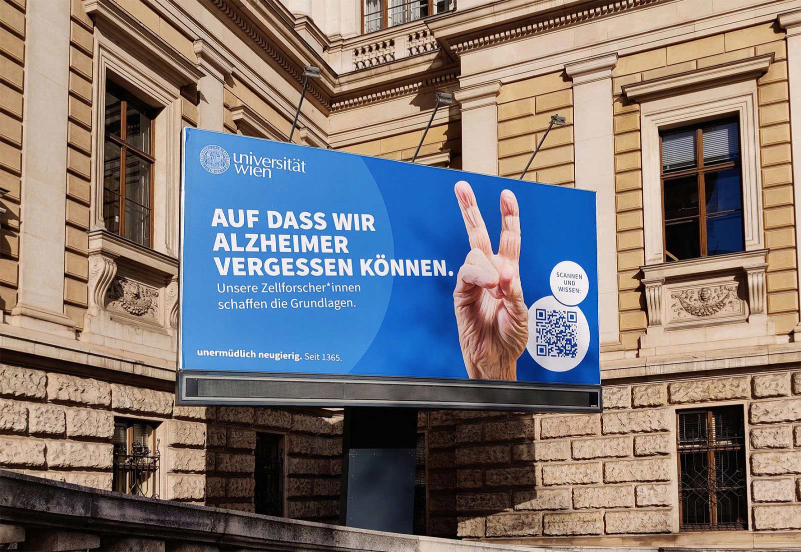 Billboard und Web werden mit einem QR-Code verbunden. So wirkt das Billboard als aufmerksamkeitsstarker Aufhänger und als Einladung, sich über die hervorragenden wissenschaftlichen Leistungen der Uni Wien im eigens entwickelten Uni Wien Online-Magazin zu informieren.